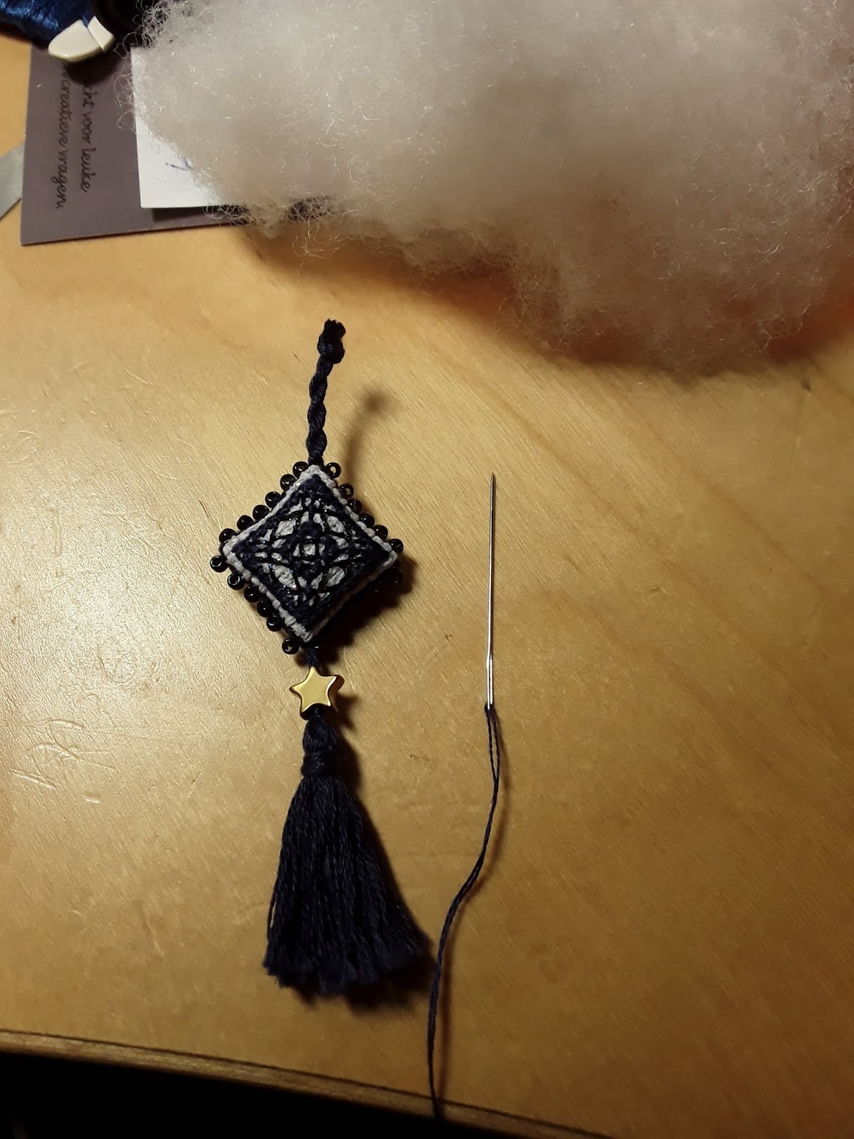 Start by making the lower part of the ornament first - remember to add the tassel and the tiny cord bit opposite each other as you make it. I added the star bead to the tassel before using it to add a little sparkle at the bottom. As it didn't fit over both threads used to hang it from I threaded one of the ends back down into the main tassel bit using my trusty mega needle and then threaded the bead onto the remaining thread.